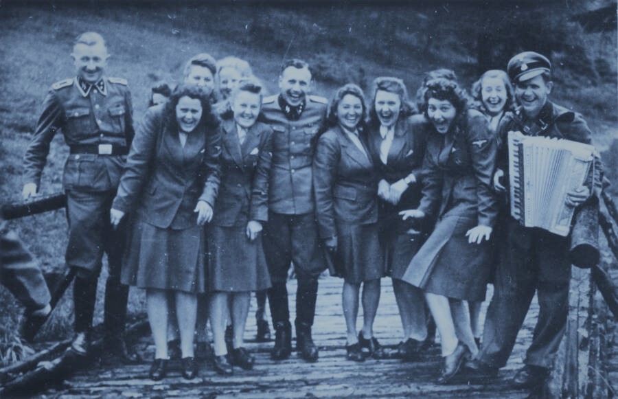 Nazi officers and female Auschwitz staff gleefully pose on a wooden bridge at Solahütte.