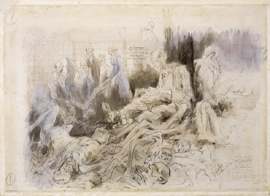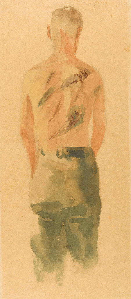 In Belsen 1945, one of Ainsworth’s most haunting pieces, a survivor lies almost indistinguishable among the pile of corpses. The blue wash he used evokes the pallor of death, blurring the line between the living and the dead—a stark visual metaphor for the profound trauma endured by those who survived.