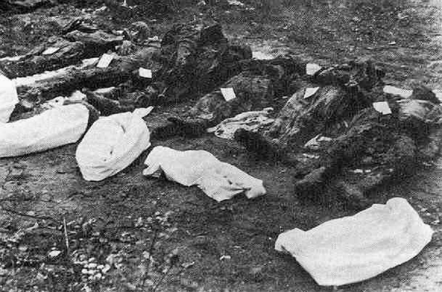 Air raid warden Hartgen arrived with a pistol. The guards made no effort to stop the mob. After the airmen collapsed, Hartgen lined six of them up and shot them in the head. Out of ammunition, he left two—Sgts. William M. Adams and Sidney E. Brown—alive but badly injured. The survivors and the bodies were loaded onto a cart and taken toward a cemetery.