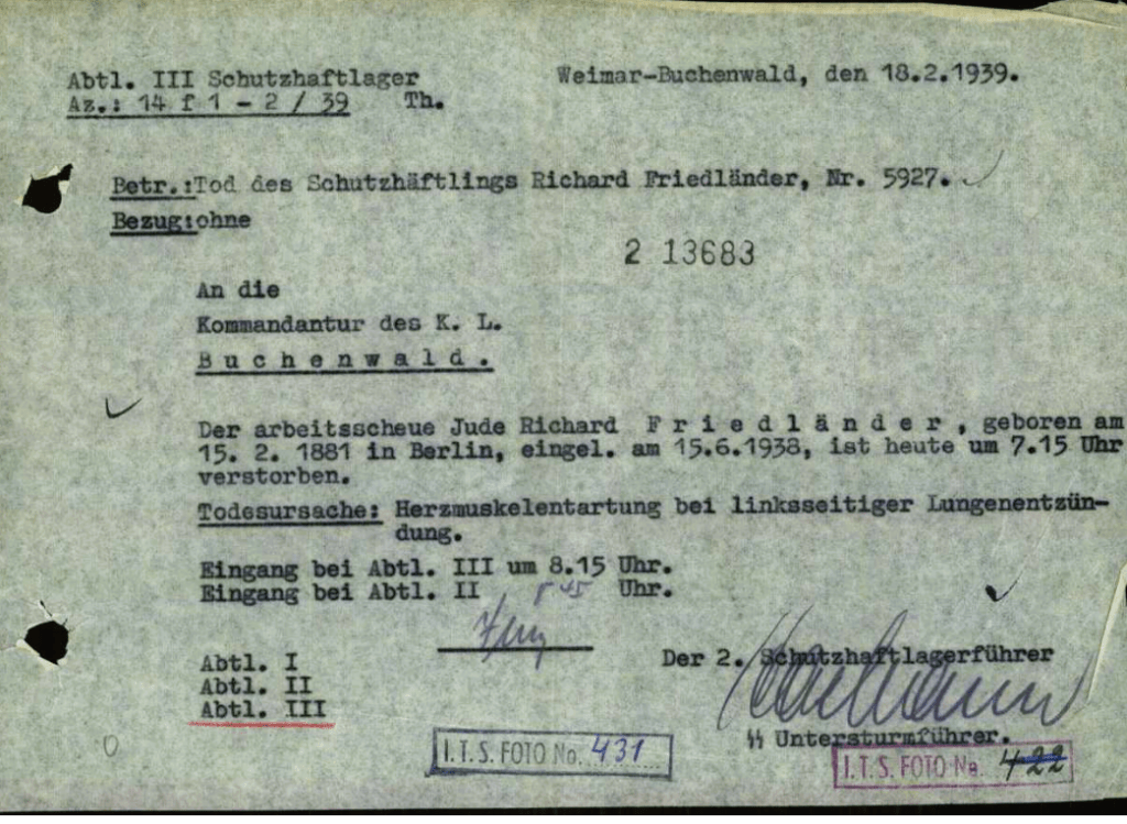 Magda’s stepfather, Richard Friedländer, who had raised her since she was 7, was Jewish. Friedländer was born to a wealthy Jewish Berlin merchant family. After attending junior and high schools, he was employed as a merchant in Brussels. In 1908, he married Auguste Behrend, who was divorced from her first husband, Oskar Ritschel, and was the mother of Magda. Magda was enrolled at the Ursuline Convent in Vilvoorde. Friedländer eventually adopted Magda. In 2016, it was reported that Friedländer may have been Magda’s biological father, as stated in his residency card, found in the Berlin archives by writer and historian Oliver Hilmes. However, Magda’s adoption may have been required for her parents’ delayed marriage to update the girl’s “illegitimate child” status. Friedlander died in the Buchenwald Concentration Camp in 1939; his daughter did not attempt to help him.