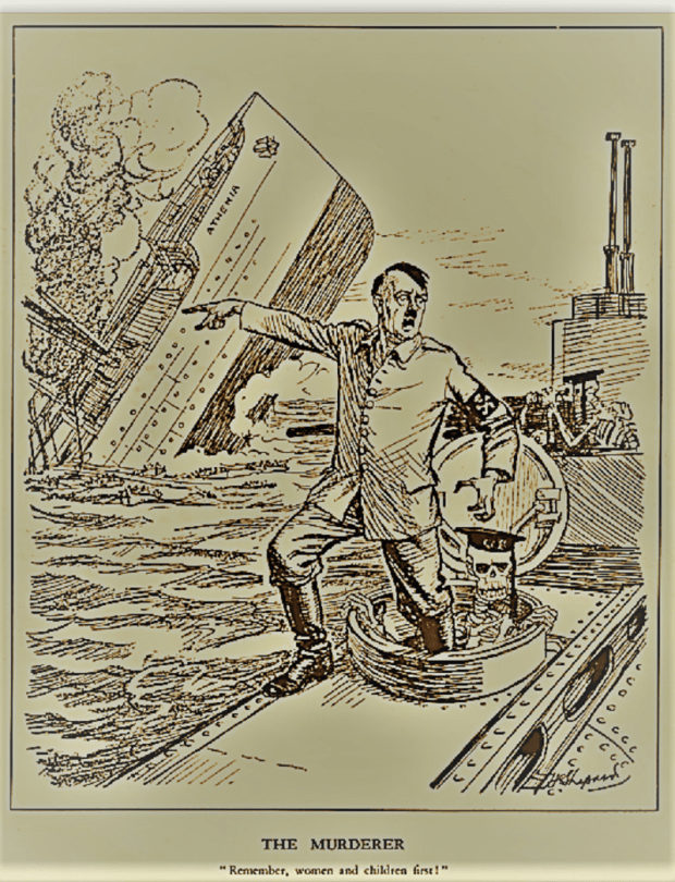 Lemp later claimed that the fact the S.S Athenia was steering a zigzag course which seemed to be well off the normal shipping routes made him believe she was either a troopship or an armed merchant cruiser; when he realized his error he took the first steps to conceal the facts by omitting to make an entry in the submarine’s log,and swearing his crew to secrecy. Adolf Hitler decided the incident should be kept secret for political reasons, and the German newspaper Völkischer Beobachter published an article which blamed the loss of the Athenia on the British, accusing Winston Churchill, then First Lord of the Admiralty, of sinking the ship to turn neutral opinion against Nazi Germany. No one in Britain believed the explanation given by Nazi Germany.