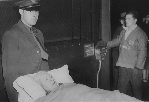 Mrs W.B. Sage, of Salt Lake City, Utah, shown here as she was carried from the S.S. Orizaba, which docked at New York, on 27 September with 150 American survivors of the Athenia disaster, many of whom, like Mrs Sage, were injured.