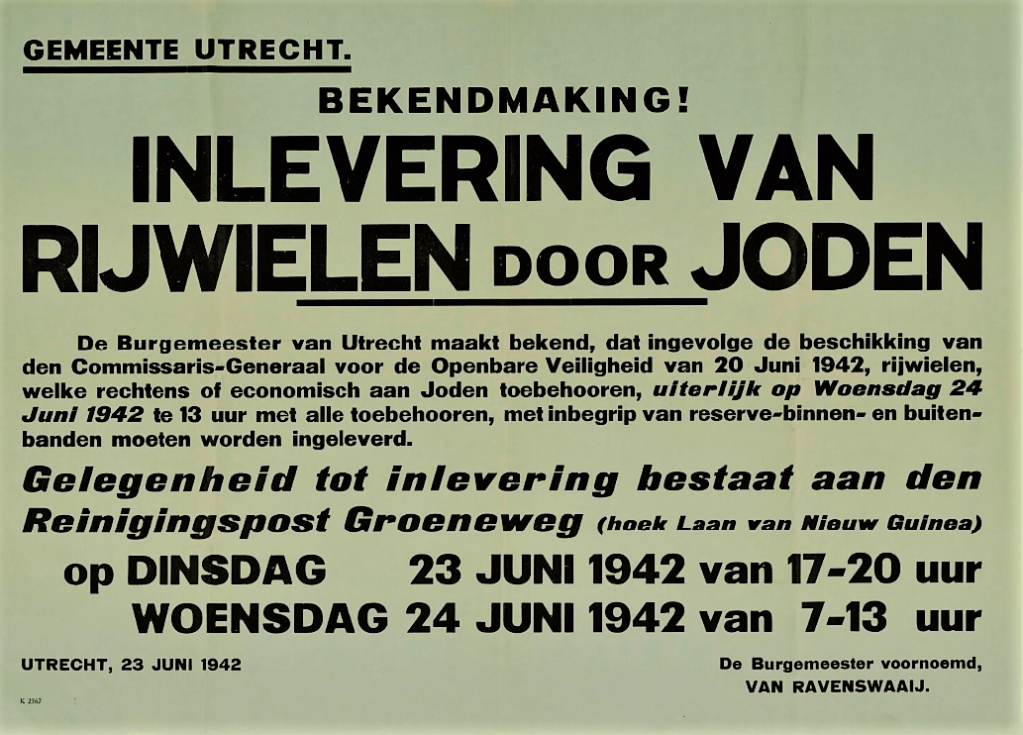 Handing over of bicycles by Jews. Jews from the municipality must hand in their bicycles, including spare inner and outer tubes, no later than June 24, 1942. Signed by mayor Van Ravenswaaij.Utrecht (this is just one example, that law was in place all over the Netherlands). Anyone who has ever been to the Netherlands will know how much the Dutch cherish their bikes.