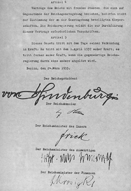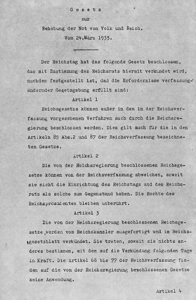 This law was preceded by the enabling act , the act which basically gave Hitler absolute power, the act passed the German parliament on 23 March 1933 and was signed by President Bismarck that same day. The scary thing is this was done via democratic measures. Below is the translation of the act. The official title of the act was “Law to Remedy the Distress of People and Reich”