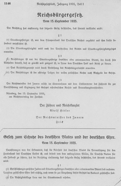 On 15 September 1935 the Nuremberg laws were passed. The Nuremberg Race Laws consisted of two pieces of legislation: the Reich Citizenship Law and the Law for the Protection of German Blood and German Honor. These laws specifically targeted the Jewish populations. Below are just some examples.