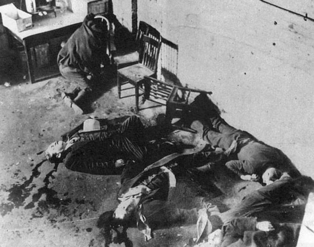 Inside the warehouse, Moran’s men were confronted by the hit men disguised as policemen. Assuming it was a routine bust, they followed instructions as they were ordered to line up against the wall. The hit men then opened fire with Thompson submachine guns, killing six of the seven men immediately. Despite 22 bullet wounds, Frank Gusenberg survived the attack but died after arriving at Alexian Brothers Hospital.
